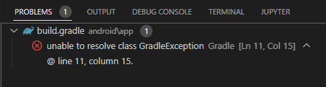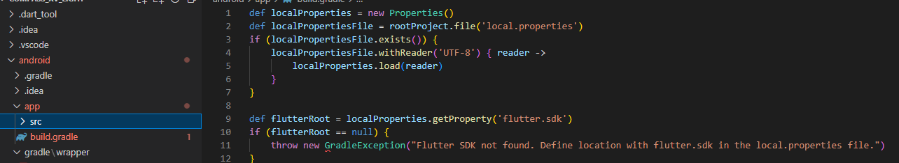 예전에는 빌드하면서 GradleException 를 발견하고 그냥 해결하고 말았는데 이번에 확인해 보니 VS Code 에서 작성된 코드를 안드로이드 스튜디오에서 불러오니 GradleException 오류가 생성되는 것을 확인하였다.