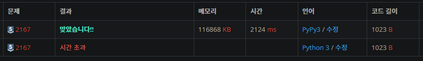 하지만 시간 초과 결과를 얻었다. 동일한 코드를 PyPy3 로 제출하면 정답처리가 된다.