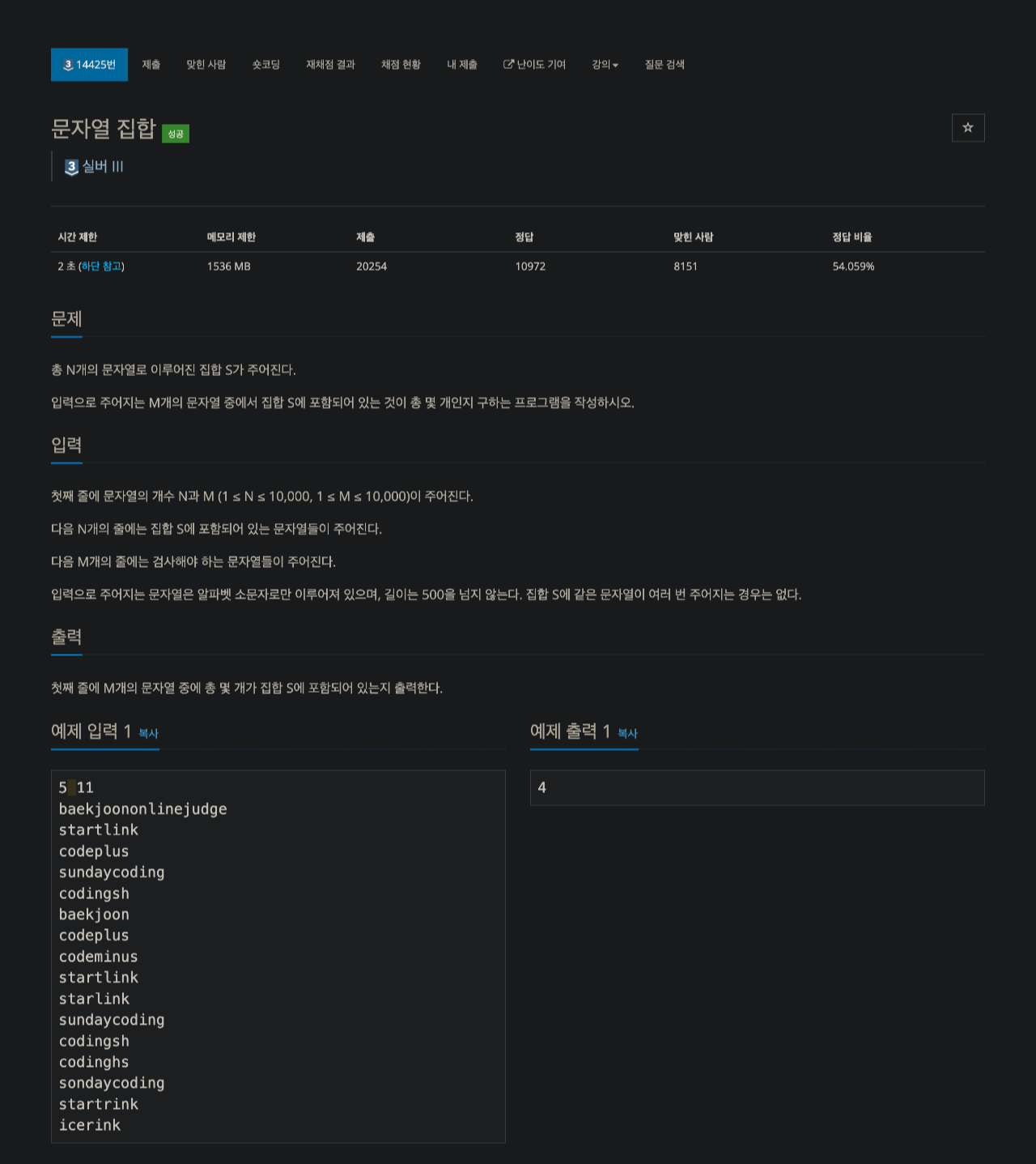 N 번 받아오는 각 문자열을 S 에 차례대로 추가를 한 후, set 또는 array 안에 해당 원소가 있는지 확인하는 코드를 작성함.