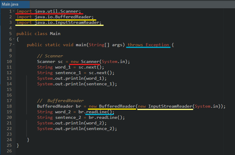 이를 해결하기 위해 BufferedReader 를 사용할 수 있다. BufferedReader 은 whitespace 가 포함된 더 긴 문장을 입력받을 수 있지만 Scanner 와 달리 문자열 String 밖에 읽지를 못한다. 반면 Scanner 은 수와 관련된 int, short, long, float 그리고 double 을 읽을 수 있다.