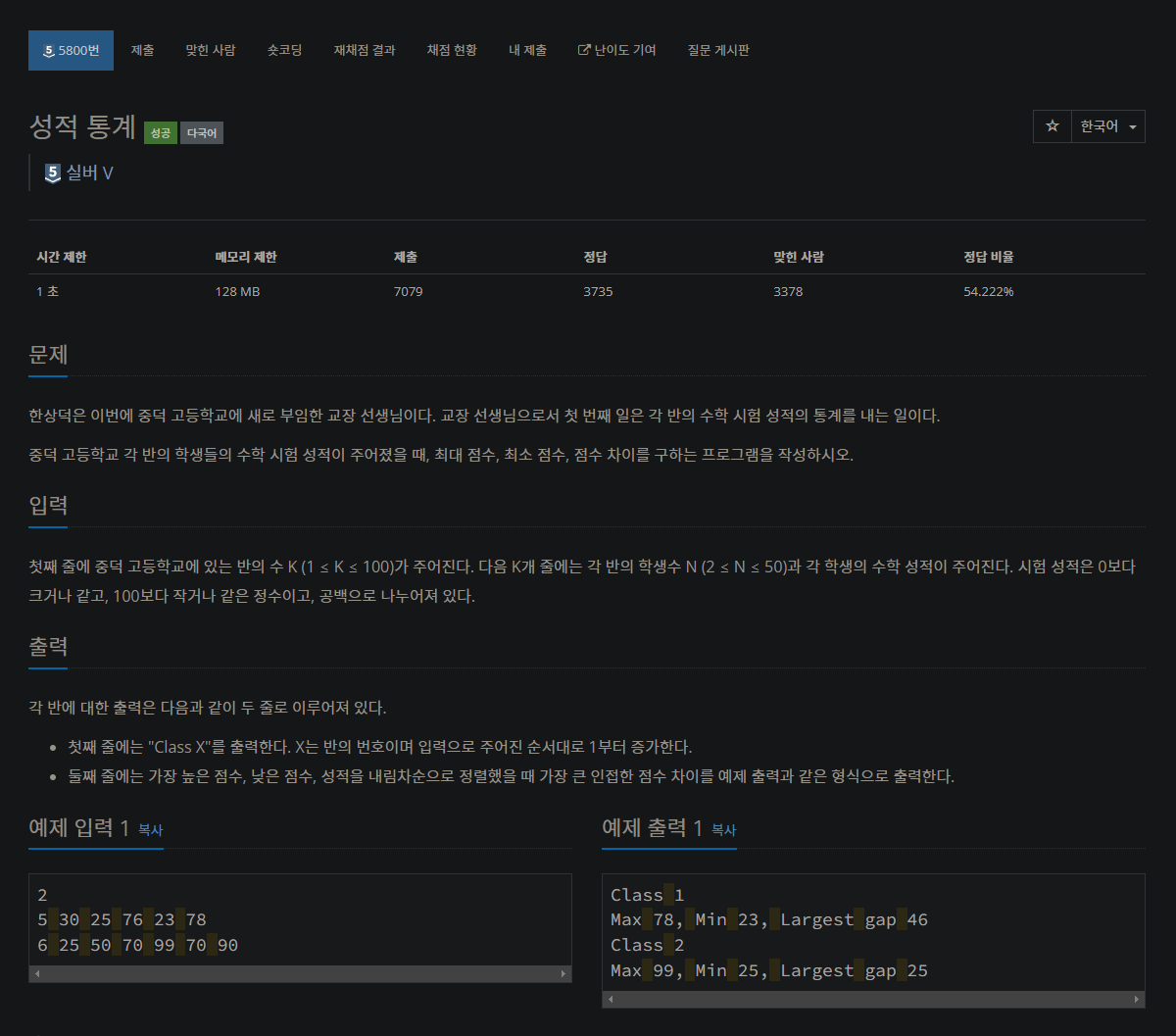 첫째 줄에 중덕 고등학교에 있는 반의 수 K (1 ≤ K ≤ 100)가 주어진다. 다음 K개 줄에는 각 반의 학생수 N (2 ≤ N ≤ 50)과 각 학생의 수학 성적이 주어진다. 시험 성적은 0보다 크거나 같고, 100보다