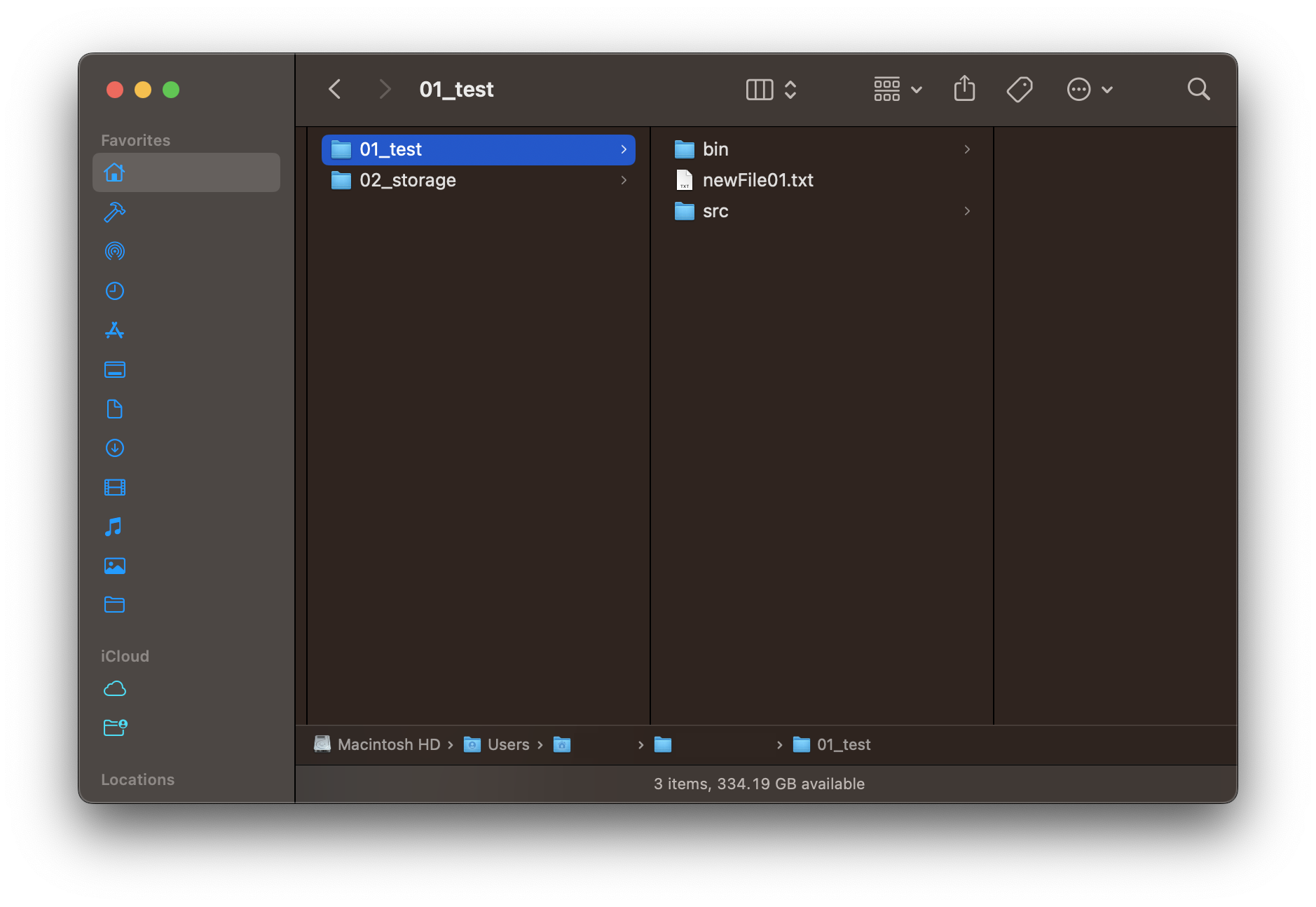 맥에서 절대경로로 파일에 접근하려면 "/Users/{account name}/files/01_test/newFile01.txt" 형식으로 작성해야 한다.