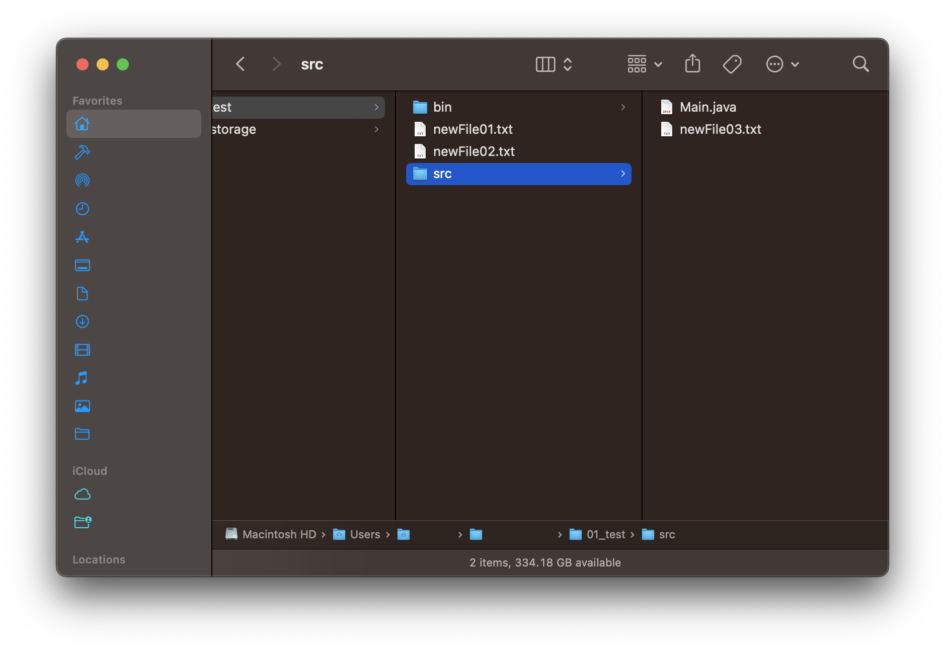 위의 예제는 프로젝트 01_test 의 하위폴더인 src 폴더에 파일 "newFile03.txt" 를 생성하였다.