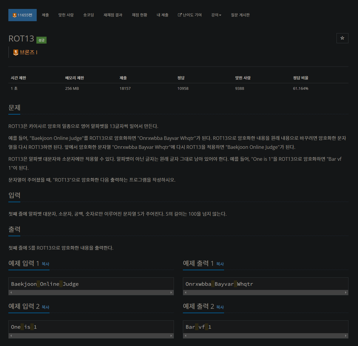 c = ((c - 65) + 13) % 26 + 65 ## 65 ~ 90 구간에 맞추기 위한.