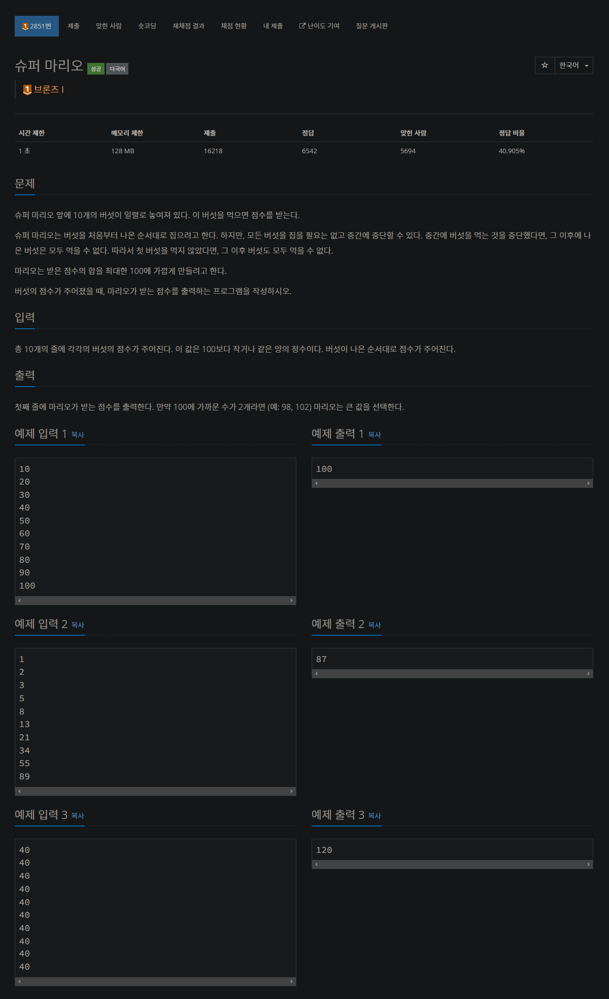첫째 줄에 마리오가 받는 점수를 출력한다. 만약 100에 가까운 수가 2개라면 (예: 98, 102) 마리오는 큰 값을 선택한다.