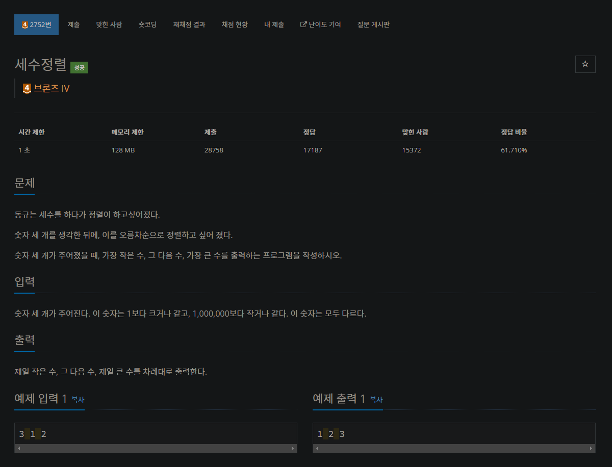 세 개의 숫자가 입력된 정렬되어지지 않은 array 를 Arrays.sort() 사용하여 정렬하고 출력한다.