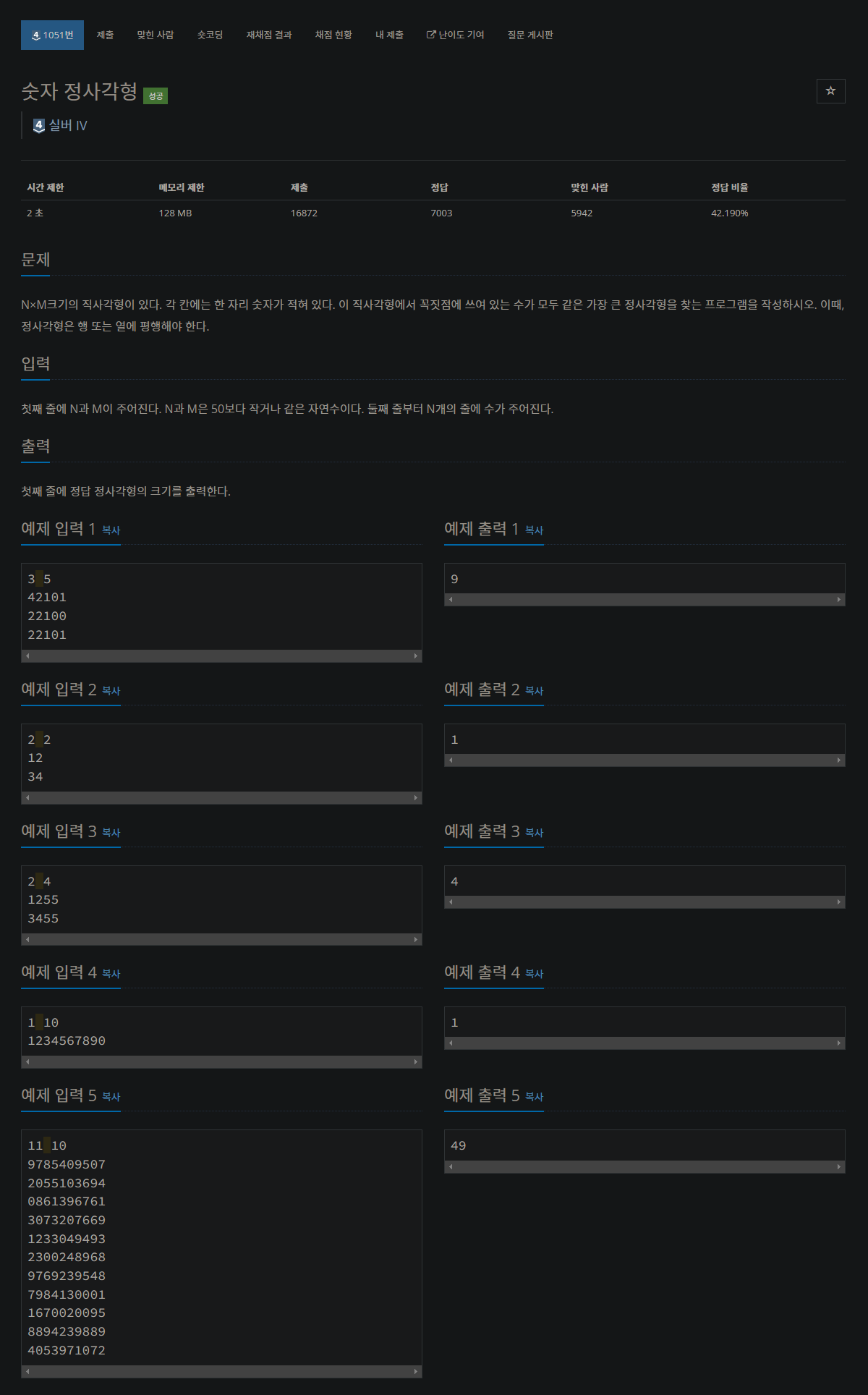 N×M크기의 직사각형이 있다. 각 칸에는 한 자리 숫자가 적혀 있다. 이 직사각형에서 꼭짓점에 쓰여 있는 수가 모두 같은 가장 큰 정사각형을 찾는 프로그램을 작성하시오. 이때, 정사각형은 행