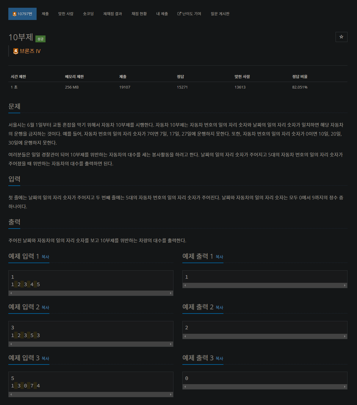 서울시는 6월 1일부터 교통 혼잡을 막기 위해서 자동차 10부제를 시행한다. 자동차 10부제는 자동차 번호의 일의 자리 숫자와 날짜의 일의 자리 숫자가 일치하면 해당 자동차의 운행을 금지하는