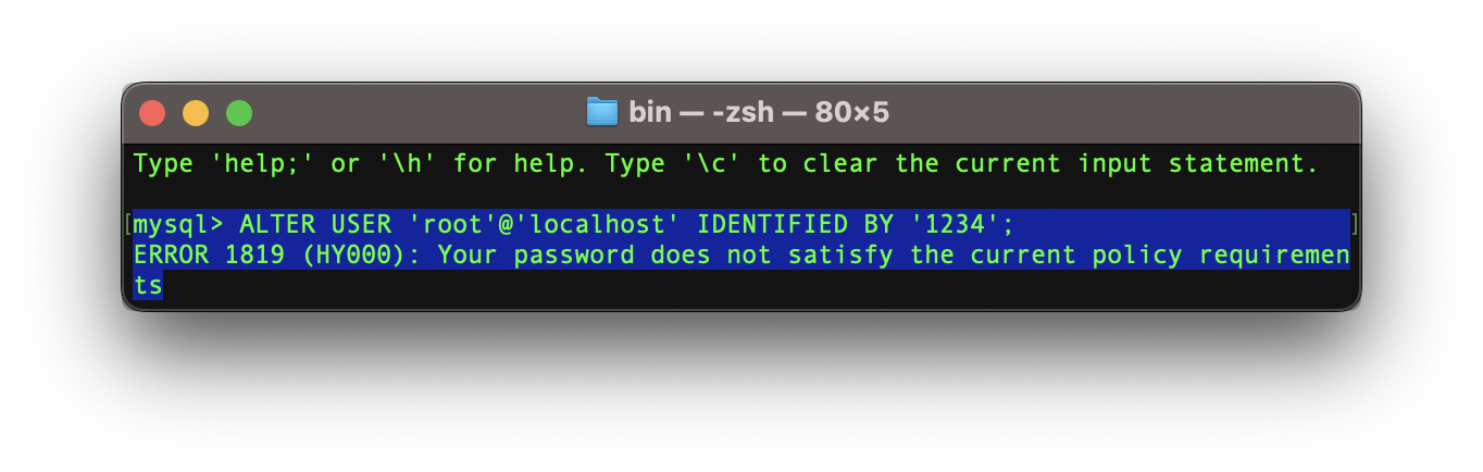 에러를 출력하였다. MySQL 비밀번호 지정을 해둔지 좀 오래되어 어떤 조건으로 설정해 놓았는지 기억나지 않았다. 여하튼, 현재 정책 요구사항에 충족하지 않는 단다.