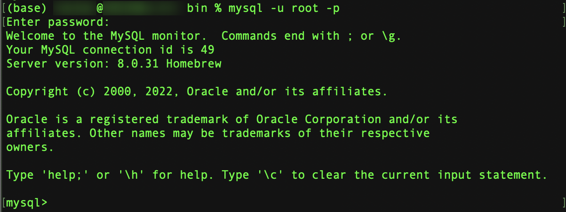 비밀번호를 입력하고 나면 위와 같이 출력되고 mysql> 에 커서가 위치한다.