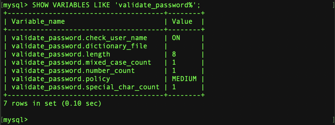 SHOW VARIABLES LIKE 'validate_password%';