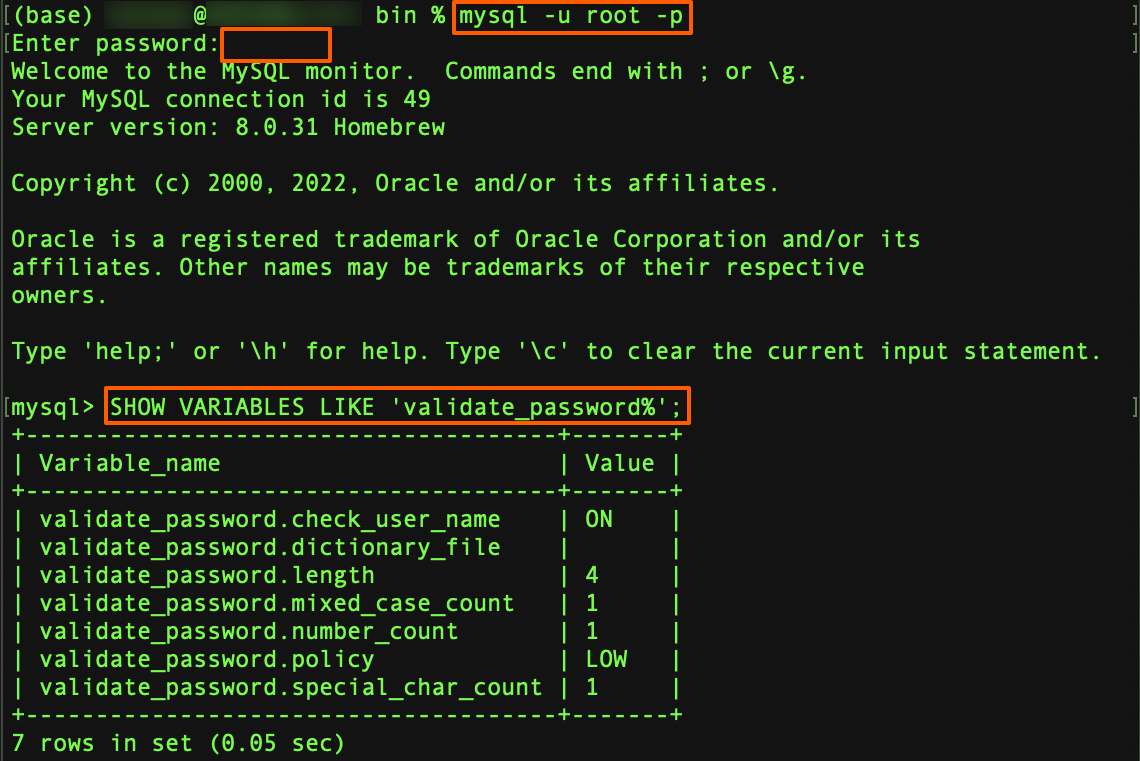 참고로 버전 8 이상에서는 validate_password.policy 처럼 .policy 를 써야 하고,