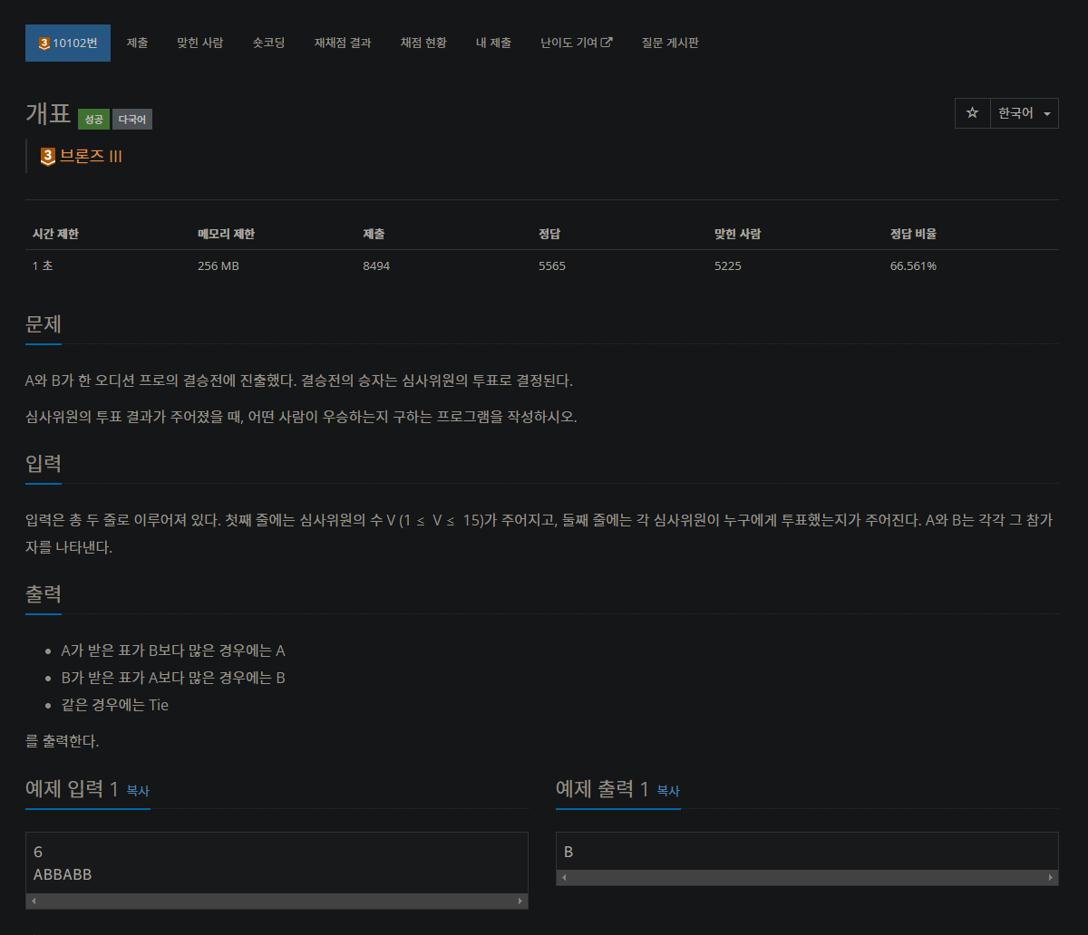 입력은 총 두 줄로 이루어져 있다. 첫째 줄에는 심사위원의 수 V (1 ≤ V ≤ 15)가 주어지고, 둘째 줄에는 각 심사위원이 누구에게 투표했는지가 주어진다. A와 B는 각각 그 참가자를 나타낸다.