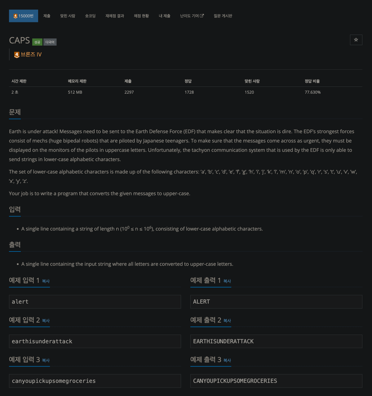 주어진 입력 문자를 string 으로 저장을 하고 upper() 을 적용하면 모든 알파벳이 대문자로 변환되어 출력된다.