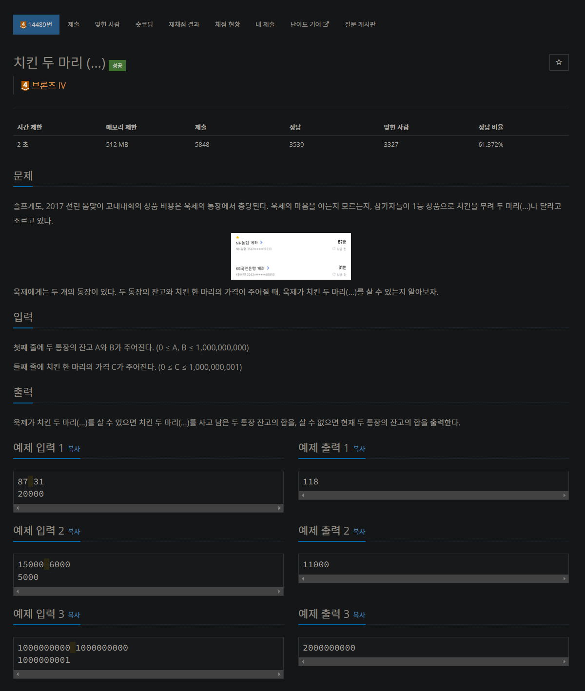 통장 잔고의 합을 구하고 치킨 두 마리의 값을 빼어본다.