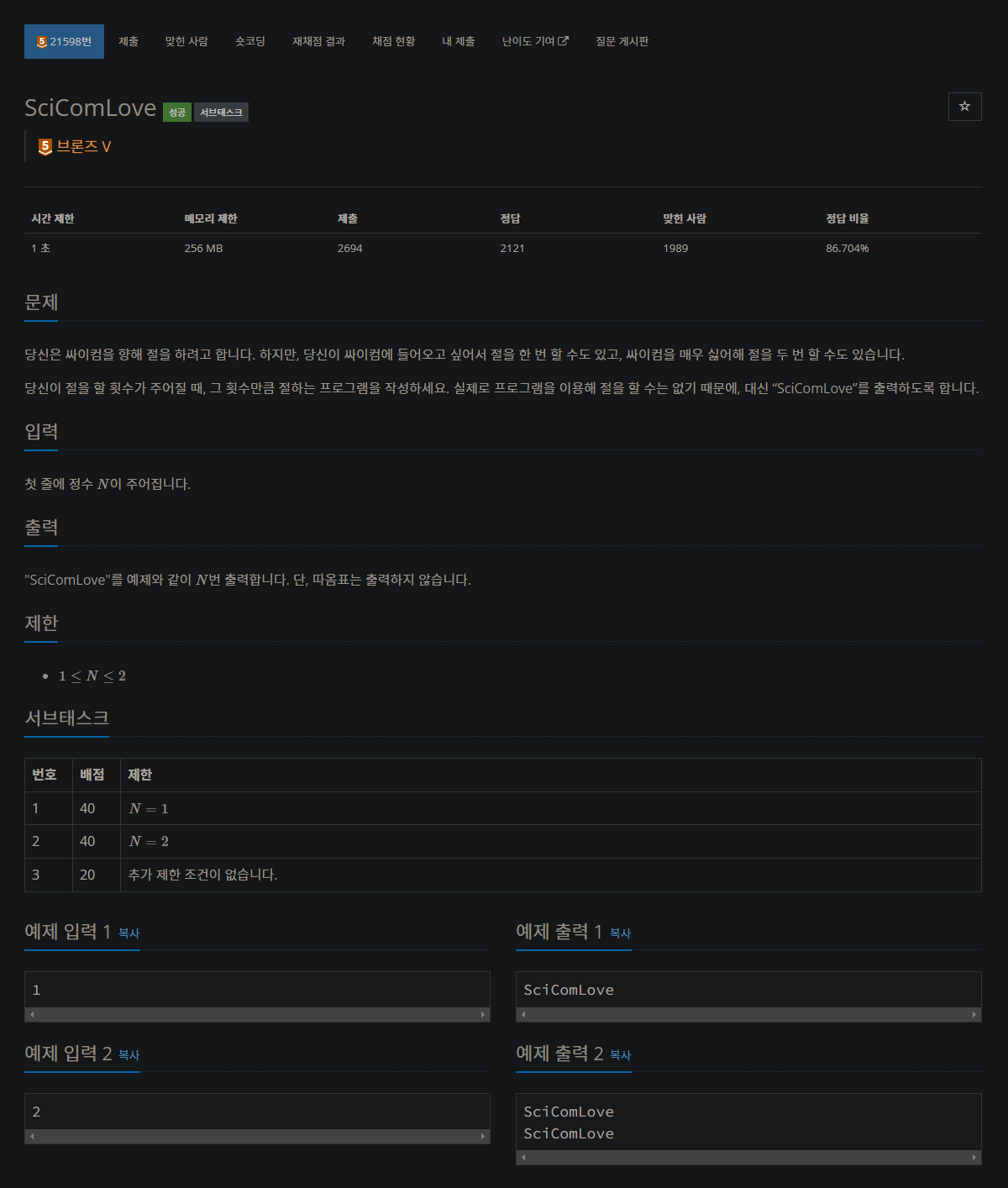 주어진 숫자만큼 "SciComLove" 를 반복 출력한다.