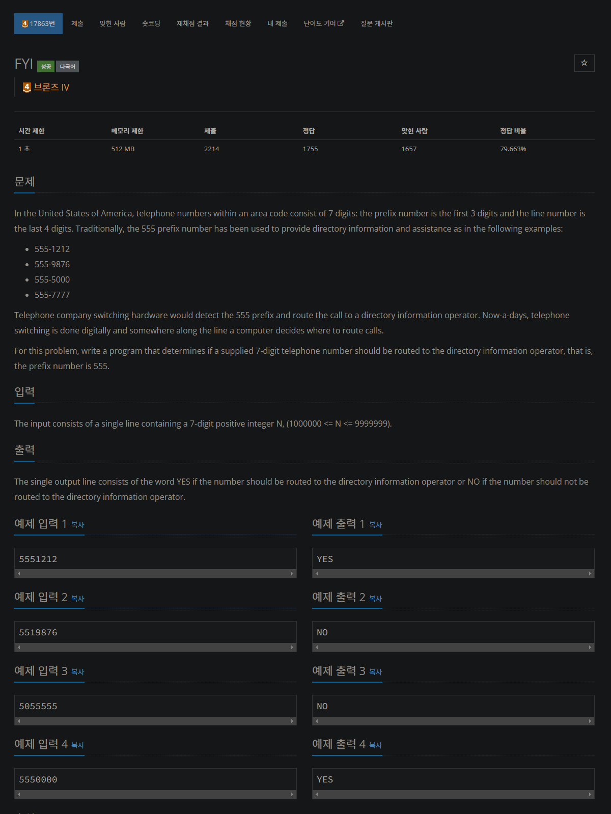 전화번호의 앞 세자리가 555 로 시작하는지 판단하는 문제이다.