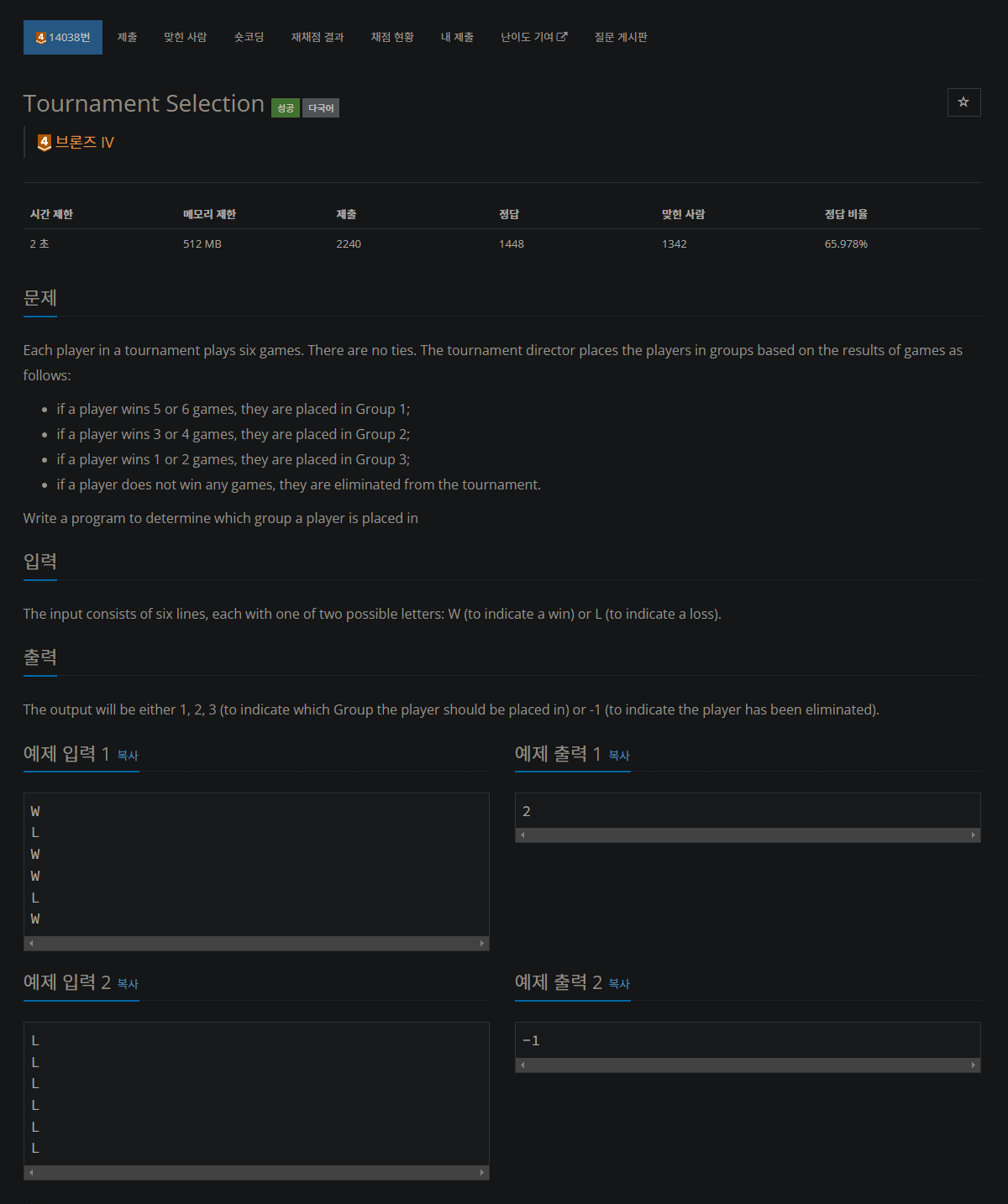 6 경기에 대해 모두 결과를 확인한 후, win_count 에 따라 조건을 나누어 필요한 문자를 출력한다.