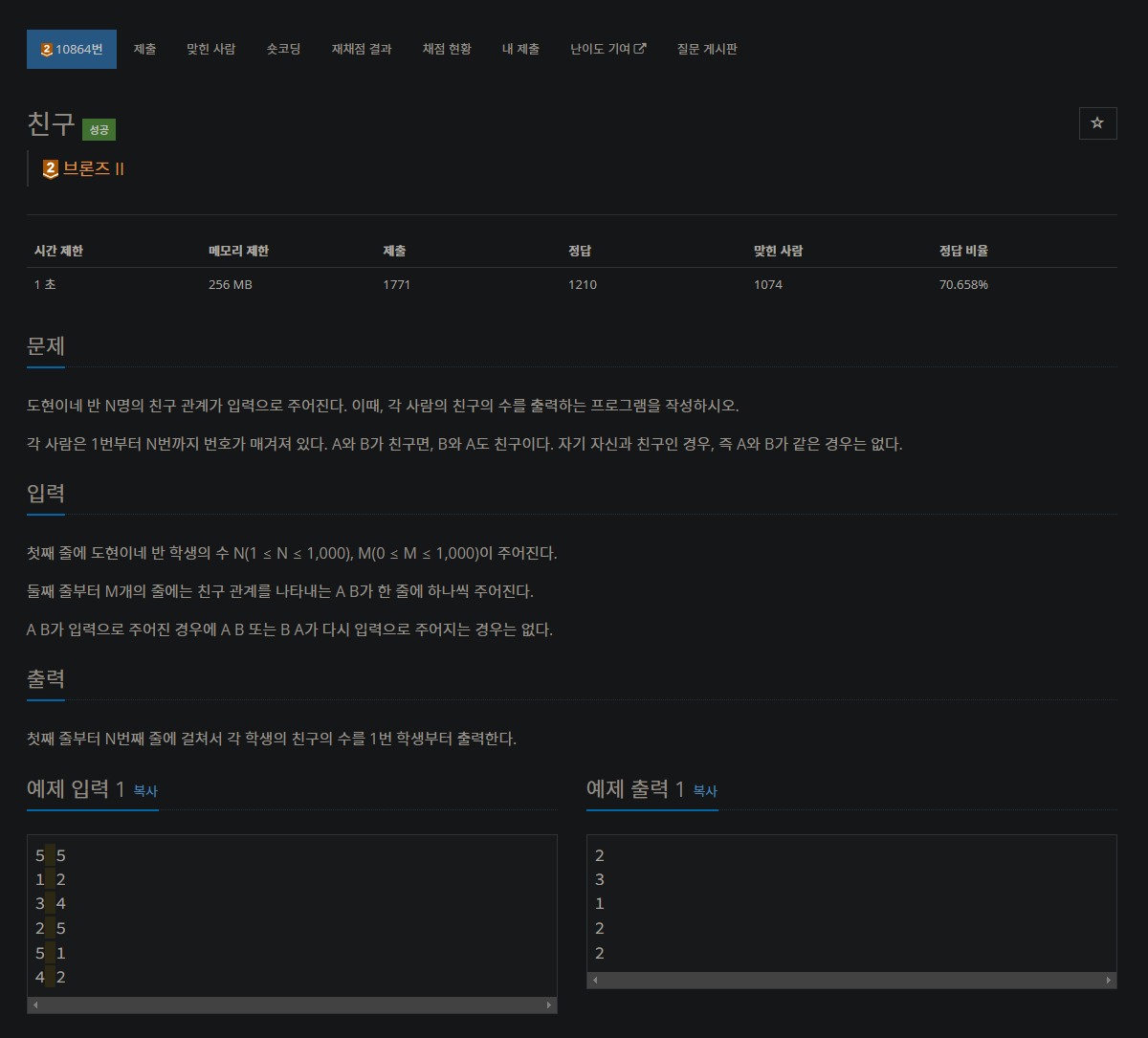 첫째 줄에 도현이네 반 학생의 수 N(1 ≤ N ≤ 1,000), M(0 ≤ M ≤ 1,000)이 주어진다. 둘째 줄부터 M개의 줄에는 친구 관계를 나타내는 A B가 한 줄에 하나씩 주어진다. A B가 입력으로 주어진 경우에 A