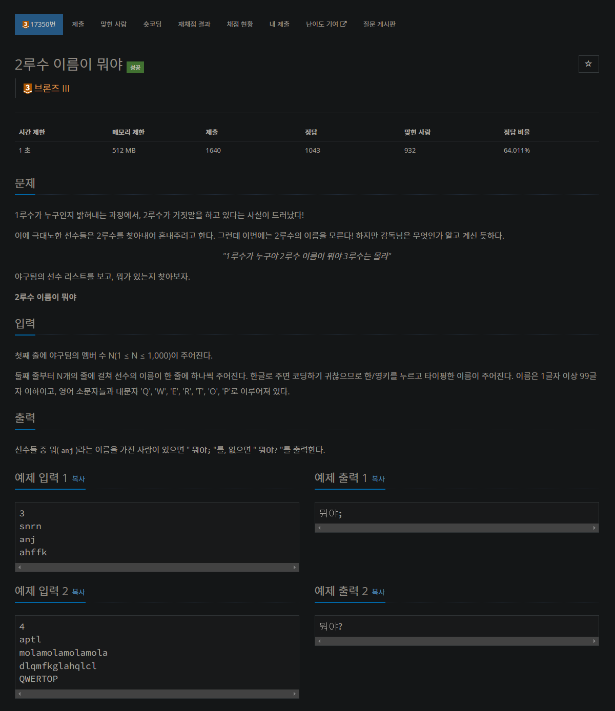 선수들 중 뭐(anj)라는 이름을 가진 사람이 있으면 "뭐야;"를, 없으면 "뭐야?"를 출력한다.