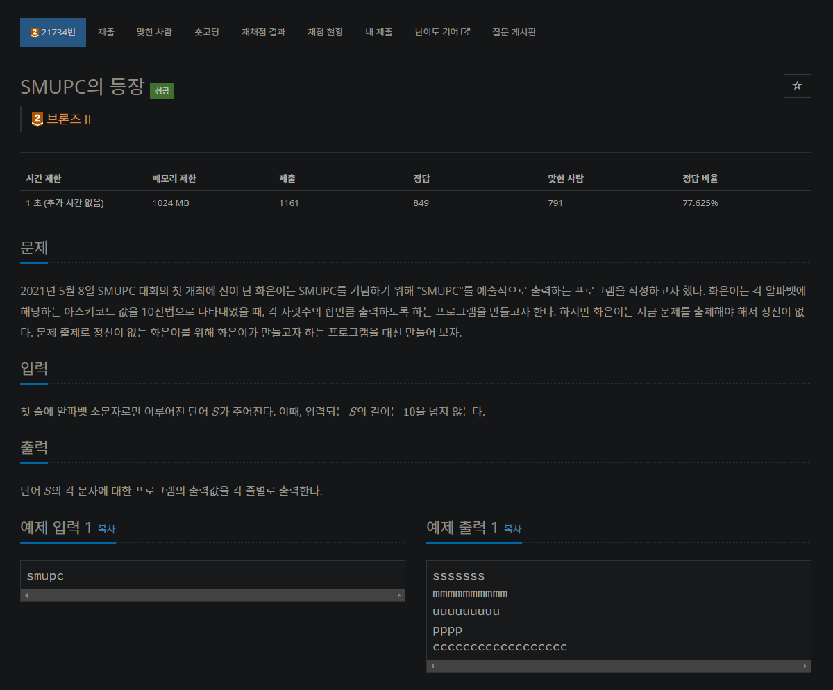 2021년 5월 8일 SMUPC 대회의 첫 개최에 신이 난 화은이는 SMUPC를 기념하기 위해 "SMUPC"를 예술적으로 출력하는 프로그램을 작성하고자 했다. 화은이는 각 알파벳에 해당하는 아스키코드 값을 10진
