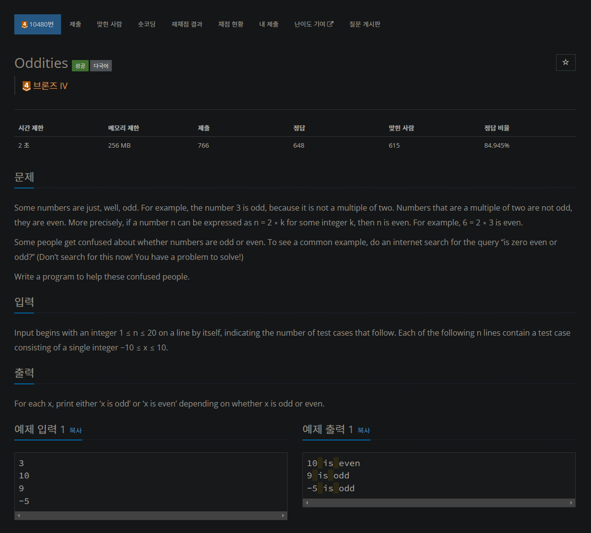 2로 나눈 나머지가 0 일 경우 "even" 에 대한 글귀로 결과를 출력하고, 그렇지 않으면 "odd" 에 대한 글귀로 결과를 출력한다.