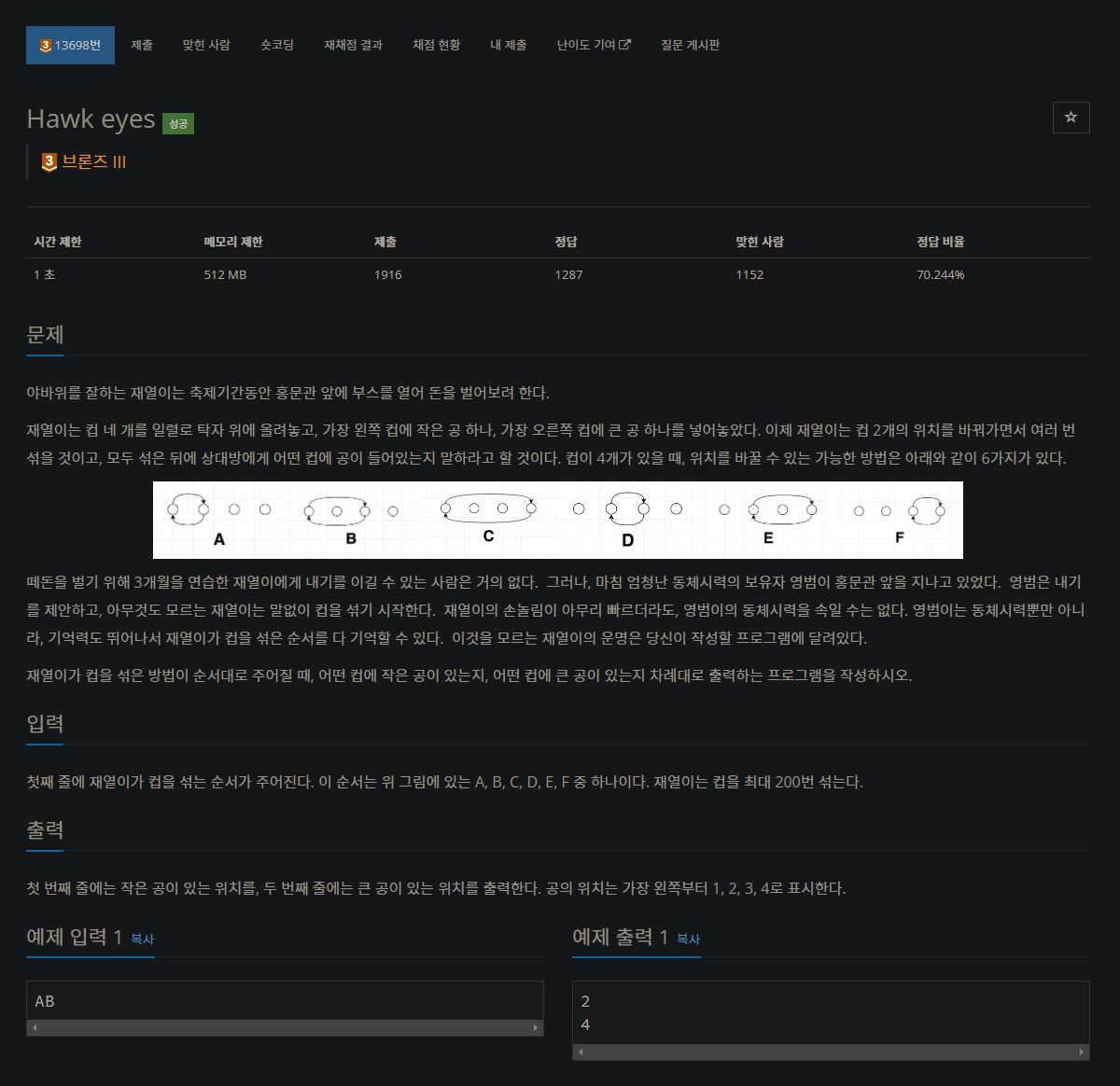 첫째 줄에 재열이가 컵을 섞는 순서가 주어진다. 이 순서는 위 그림에 있는 A, B, C, D, E, F 중 하나이다. 재열이는 컵을 최대 200번 섞는다.