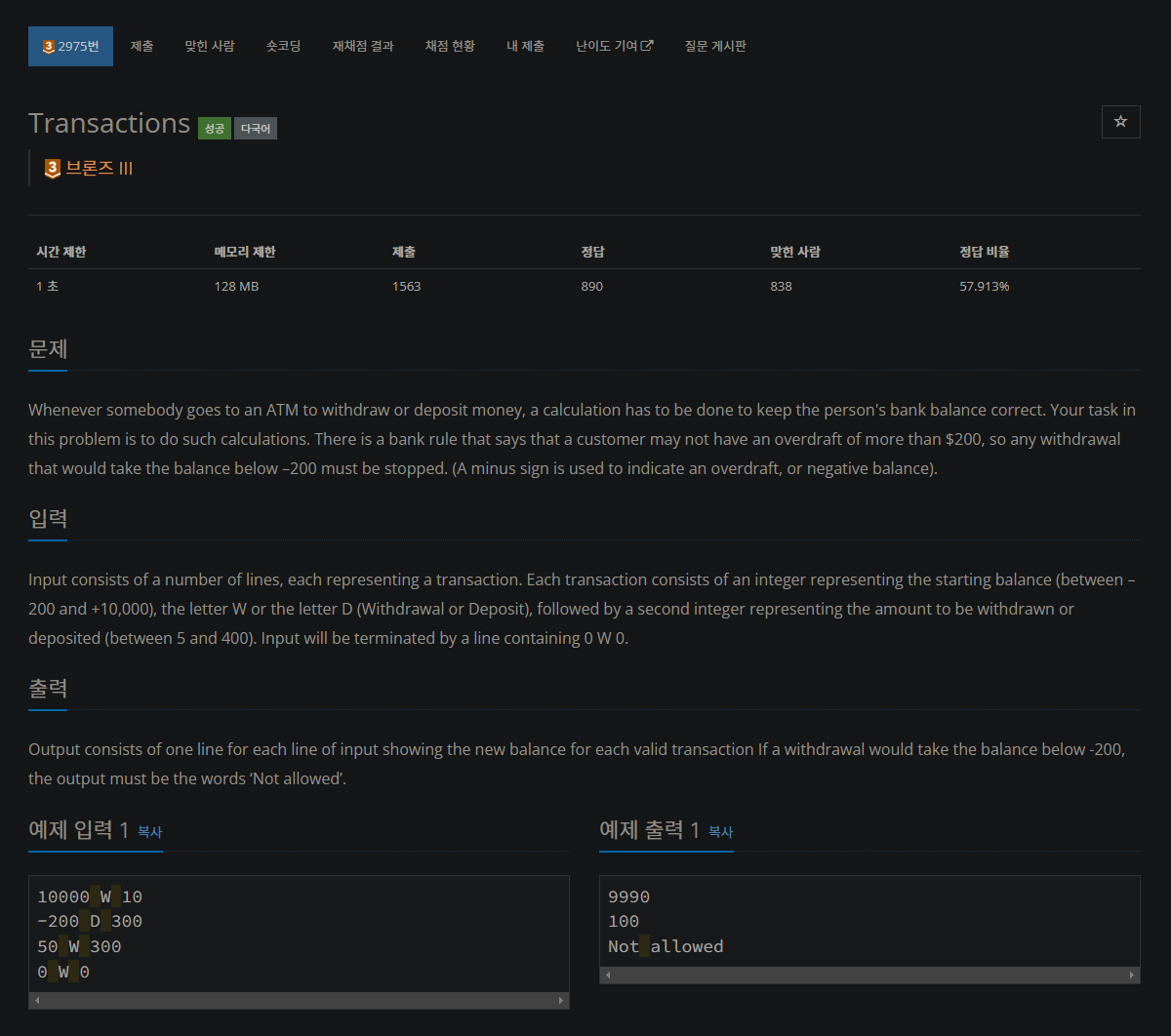 그 외 경우인 "W" 가 입력 되었을때에는 은행에 남아있는 돈과 과도하게 찾으려는 돈에 의해 -200 미만이 되면 "Not allowed" 를 출력하고, 그렇지 않으면 출금 후 남은 돈의 계산 결과를 출력한다.