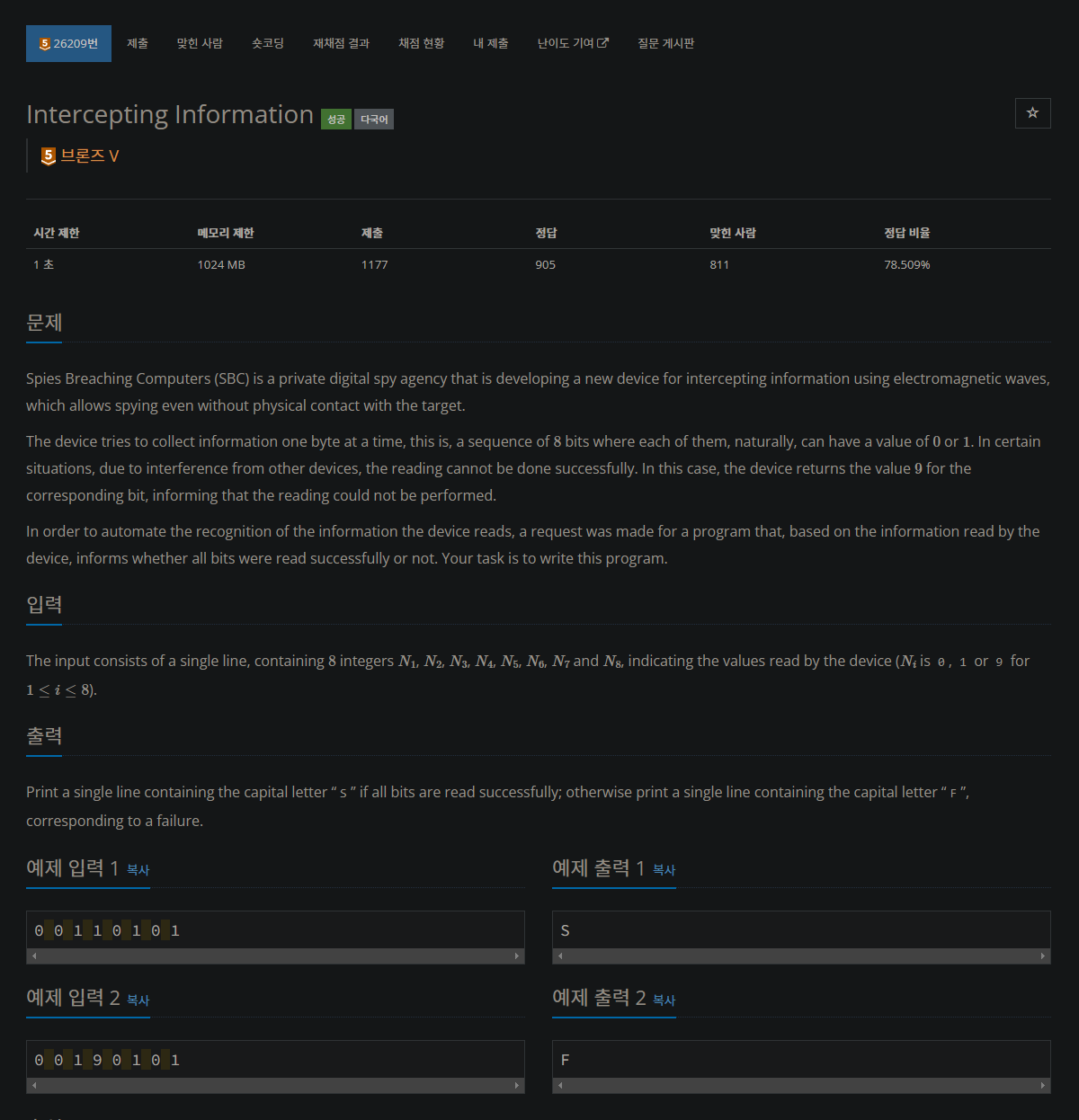 8 개의 숫자가 모두 확인되고 나면 isBit 의 상태에 따라 "S" 또는 "F" 를 출력한다.