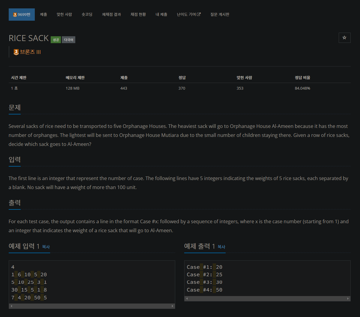 For each test case, the output contains a line in the format Case #x: followed by a sequence of integers, where x is the case number (starting from 1) and an integer that indicates the weight of a rice sack that will go to Al-Ameen.
