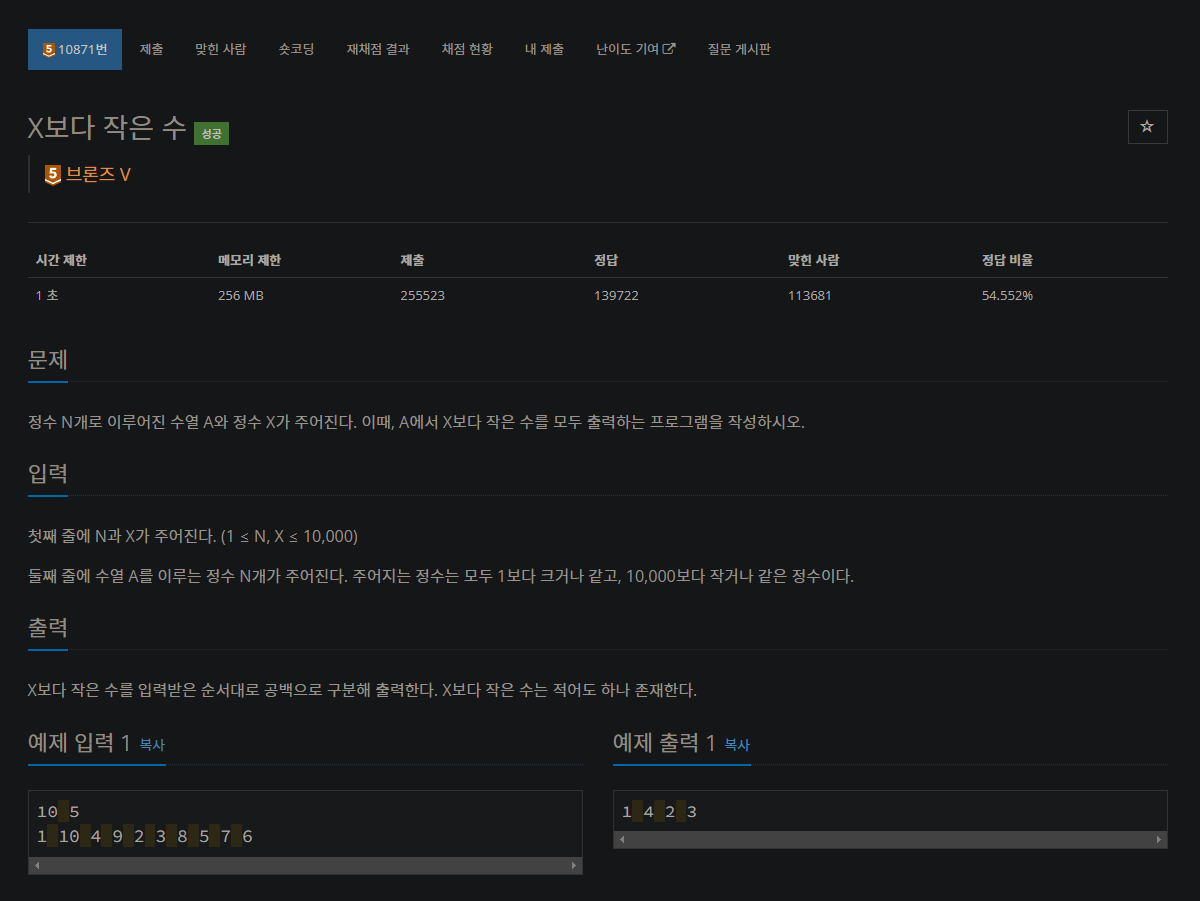 주어진 n 만큼 반복문을 실행하면서 숫자를 입력 받는다. 그 입력 받은 숫자가 x 보다 작을 경우 그 숫자와 빈칸 하나를 같이 출력한다.