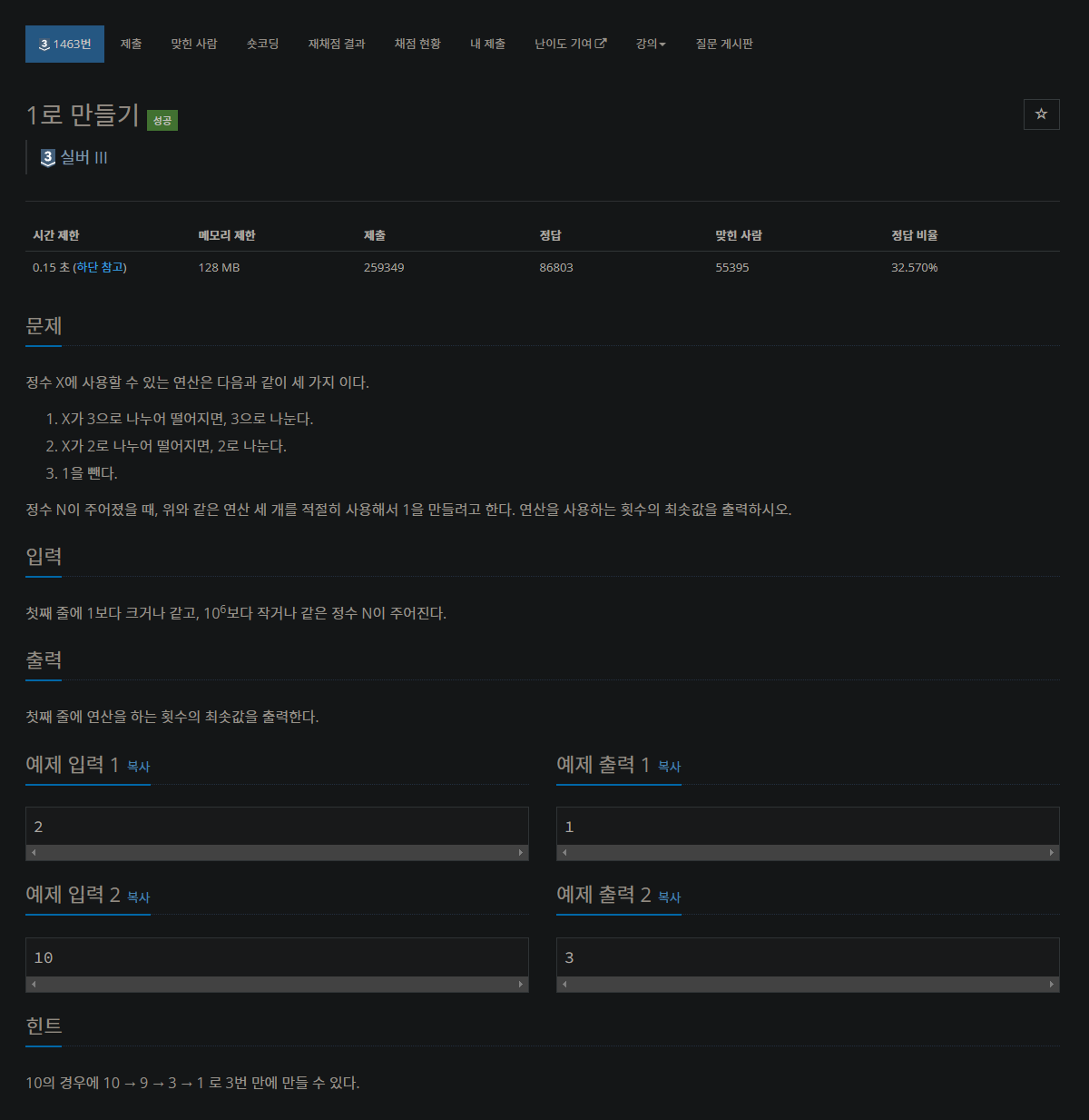 dp[i] = Math.min(dp[i], dp[i / 3] + 1); // 3으로 나누는 연산을 수행한 경우