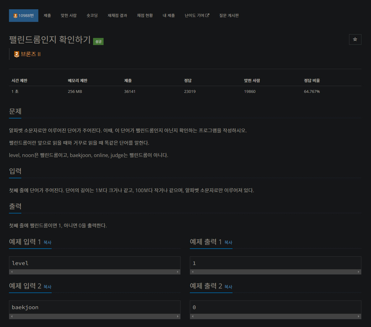 10988번: 팰린드롬인지 확인하기