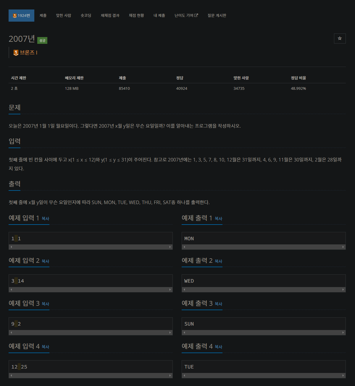 첫째 줄에 빈 칸을 사이에 두고 x(1 ≤ x ≤ 12)와 y(1 ≤ y ≤ 31)이 주어진다. 참고로 2007년에는 1, 3, 5, 7, 8, 10, 12월은 31일까지, 4, 6, 9, 11월은 30일까지, 2월은 28일까지 있다.