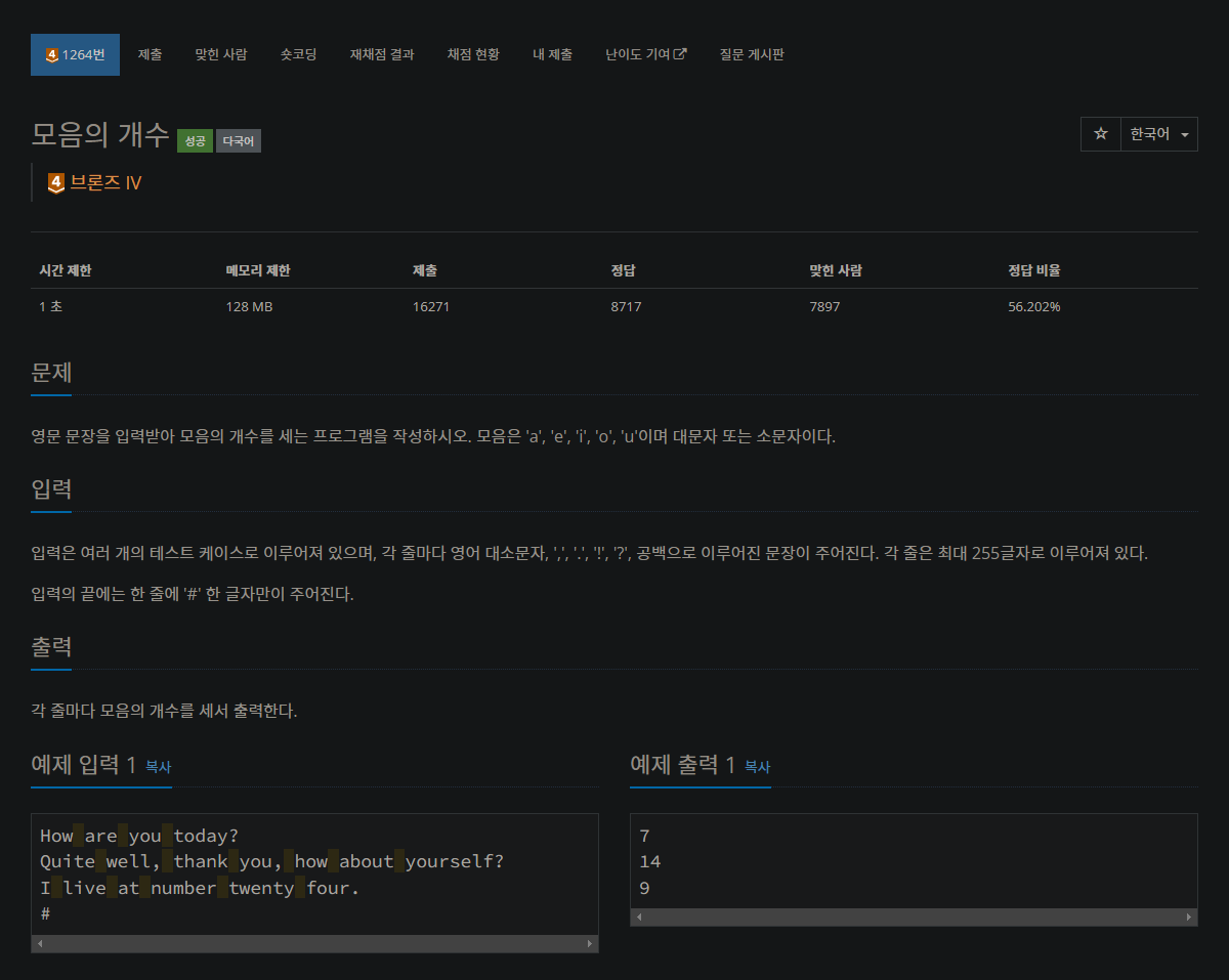 확인해야 할 모음은 "aeiouAEIOU" 이며 변수 vowels 에 String 으로 저장한다.