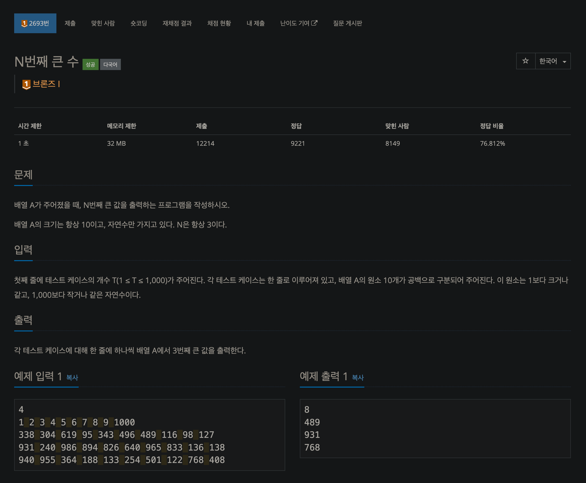 int result = arr[10 - theNth]; // 오름차순 정렬된 array의 3번째 큰수는 index 7