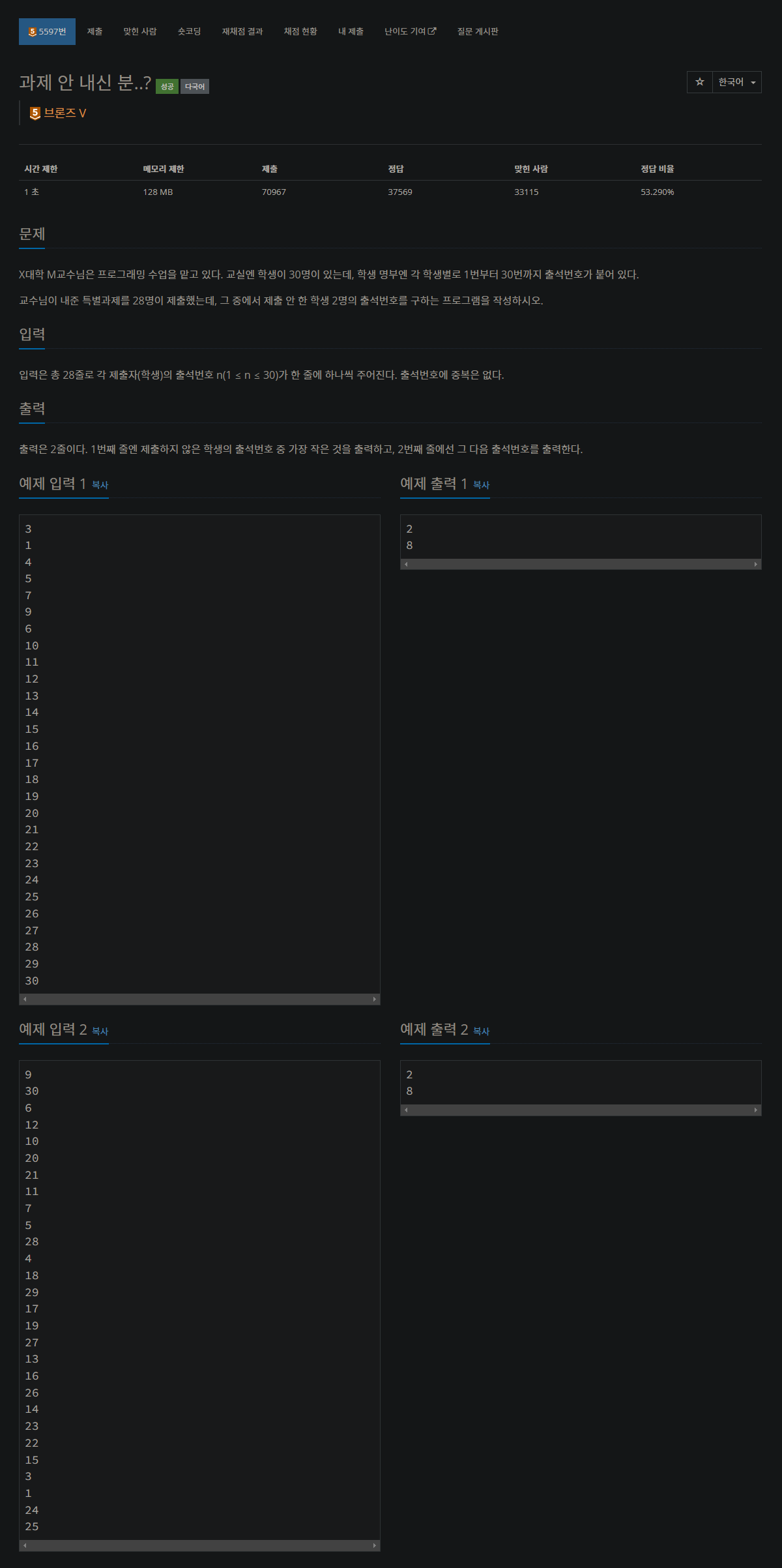 X대학 M교수님은 프로그래밍 수업을 맡고 있다. 교실엔 학생이 30명이 있는데, 학생 명부엔 각 학생별로 1번부터 30번까지 출석번호가 붙어 있다. 교수님이 내준 특별과제를 28명이 제출했는데,