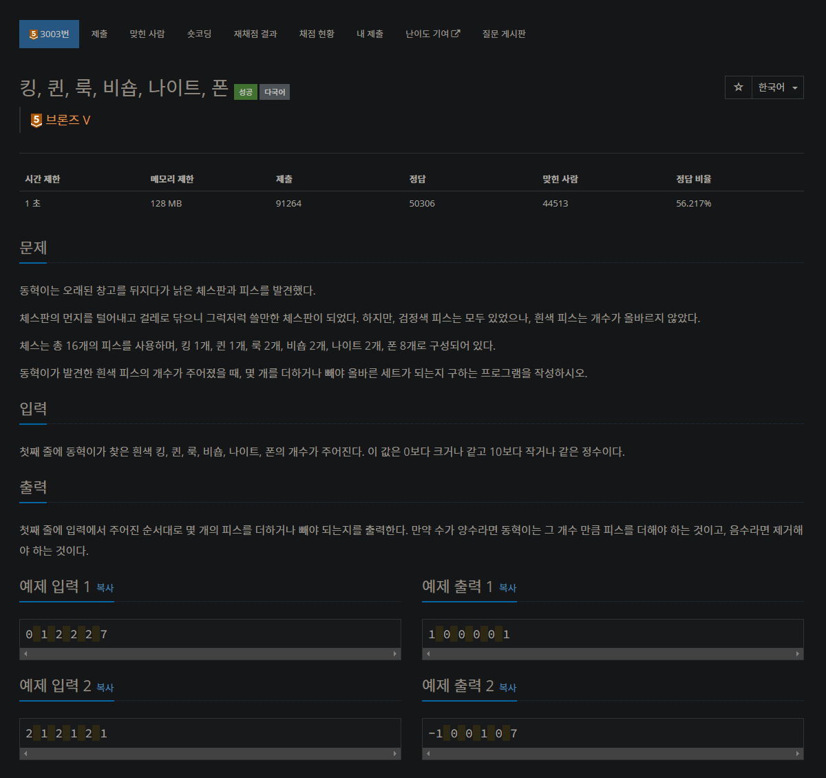 3003번: 킹, 퀸, 룩, 비숍, 나이트, 폰