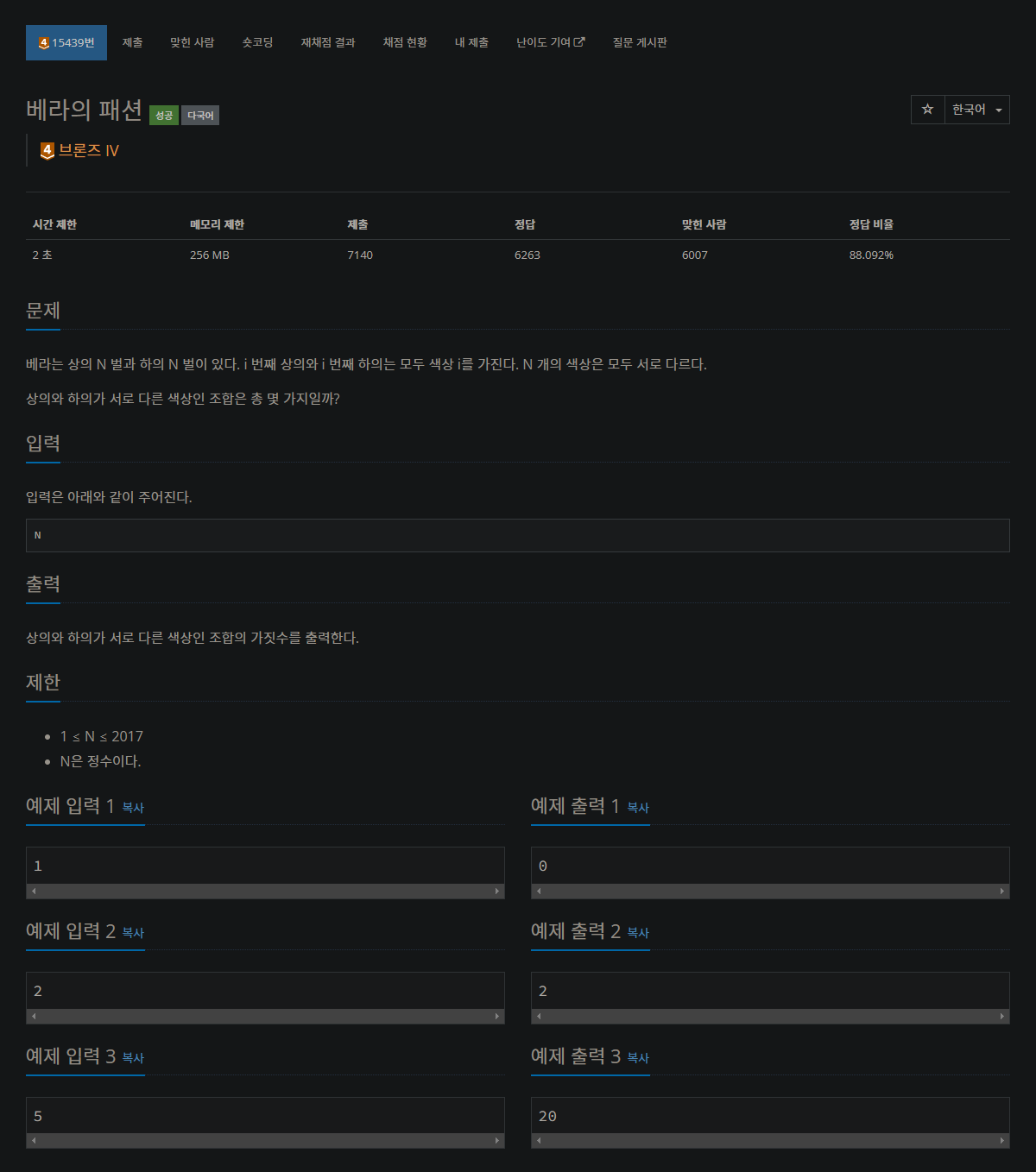 베라는 상의 N 벌과 하의 N 벌이 있다. i 번째 상의와 i 번째 하의는 모두 색상 i를 가진다. N 개의 색상은 모두 서로 다르다. 상의와 하의가 서로 다른 색상인 조합은 총 몇 가지일까?