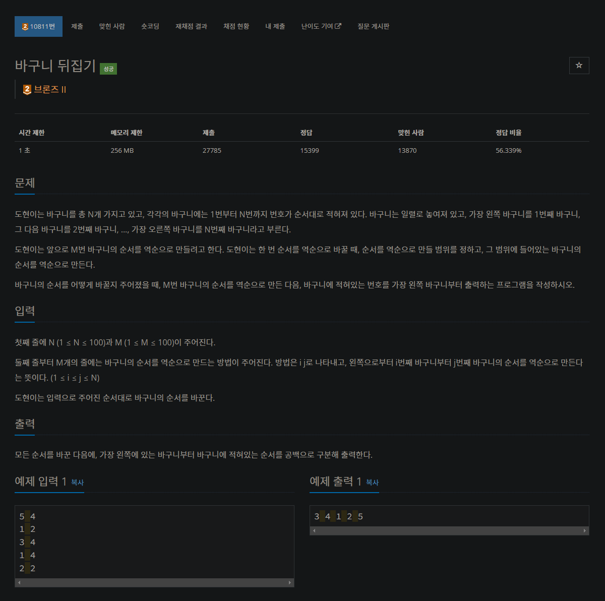 도현이는 바구니를 총 N개 가지고 있고, 각각의 바구니에는 1번부터 N번까지 번호가 순서대로 적혀져 있다. 바구니는 일렬로 놓여져 있고, 가장 왼쪽 바구니를 1번째 바구니, 그 다음 바구니를 2
