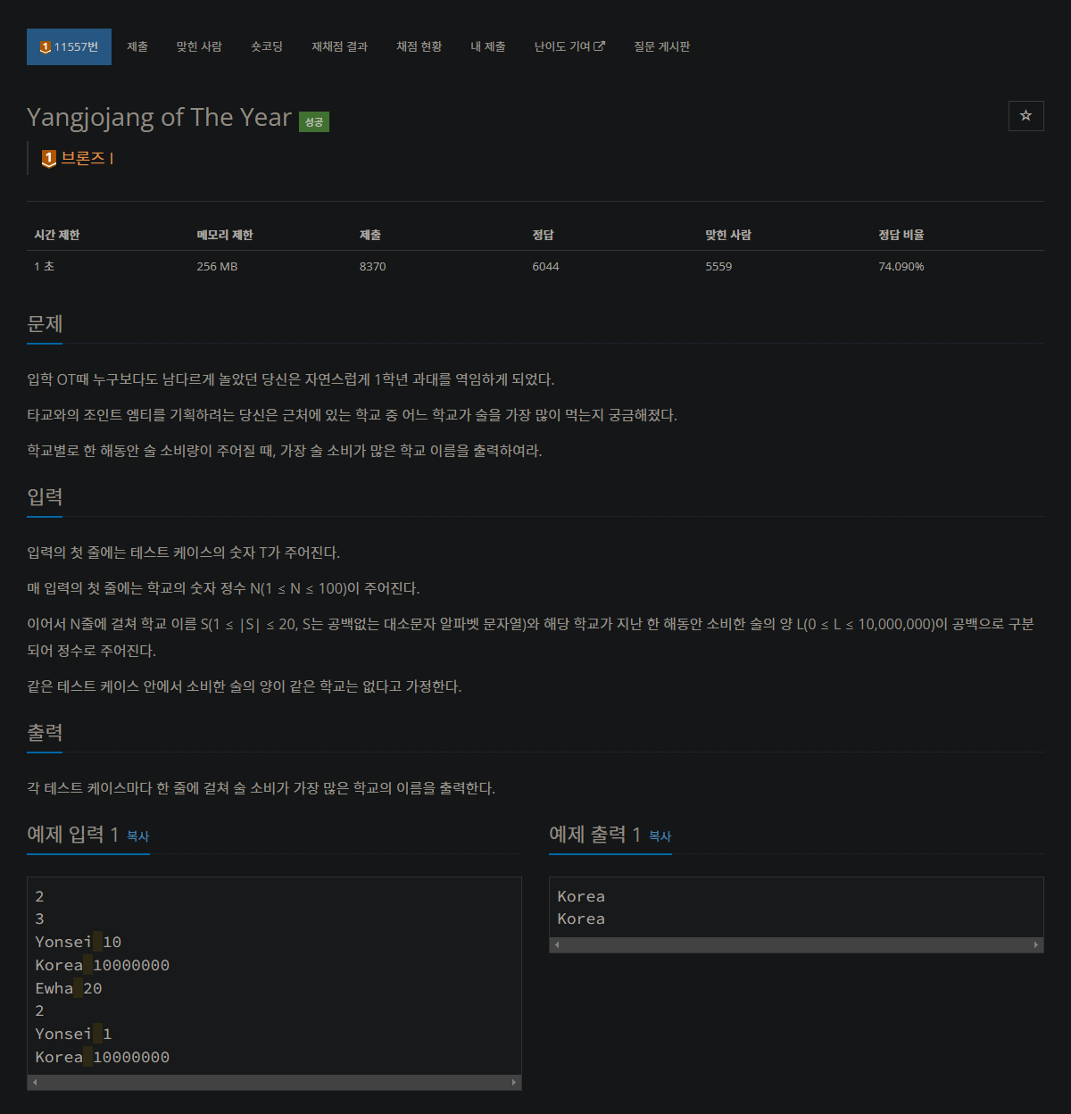 학교의 이름과 술 소비량을 입력받으면서 소비량이 이전에 입력 받은 값보다 큰지 확인을 하고 만약 크다면 그 값과 학교 이름을 저장한다. 모든 학교와 소비량이 입력되면 최대 소비량 데이터를 얻을 수 있다.