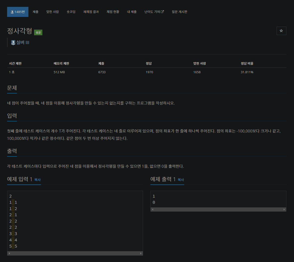네 개의 좌표를 통해 총 6가지의 두 점 사이의 거리를 찾을 수 있다. 이 결과를 오름차순 정렬하여 짧은 4개가 같고 긴 2개가 같으면 정사각형 조건임을 이용한다.