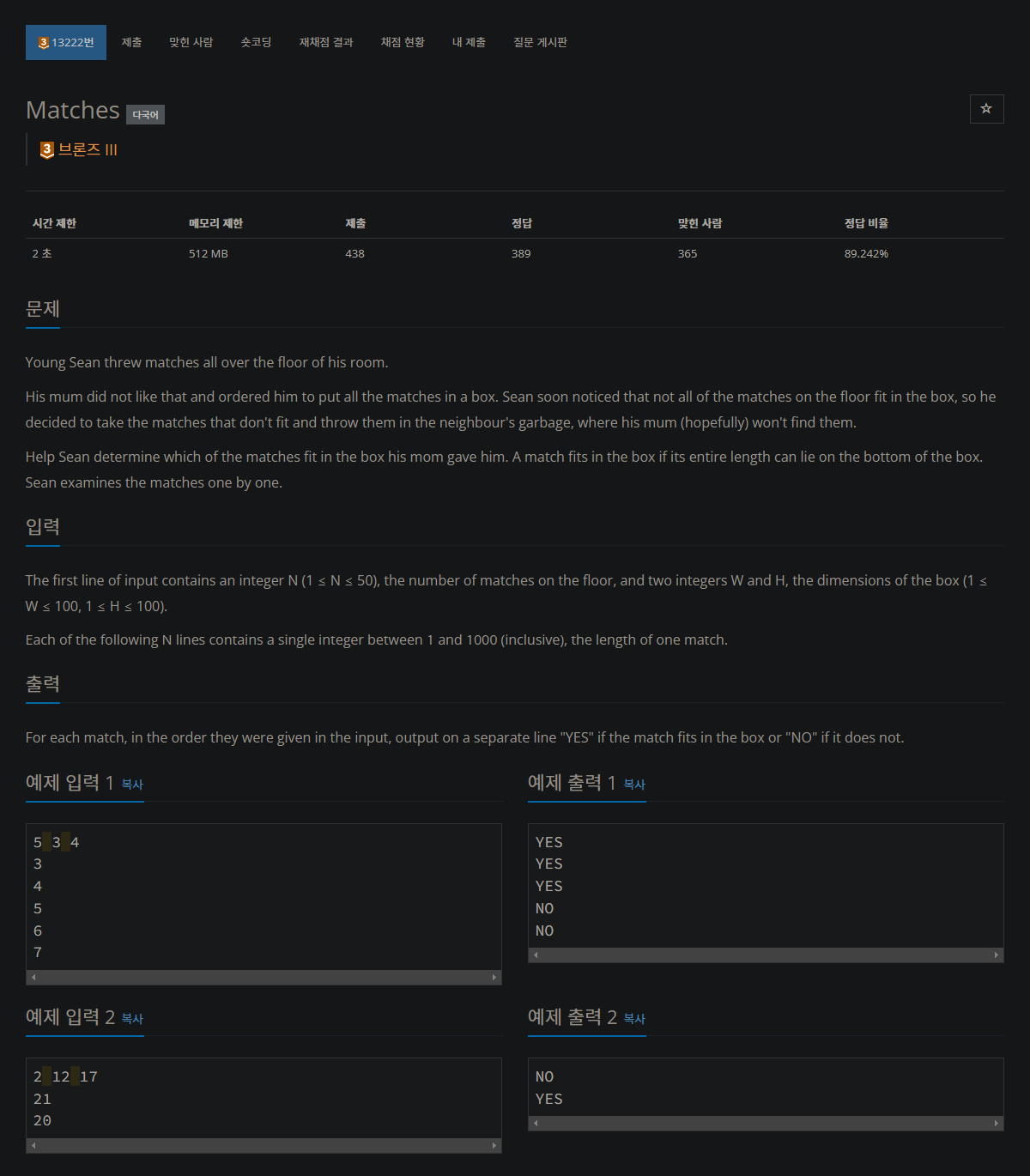 직사각형 바닥에서 가능한 최대 길이인 대각선 길이를 계산한 후 성냥이 대각선 보다 작거나 같으면 `YES`를 출력하고 그렇지 않으면 `NO`를 출력한다.