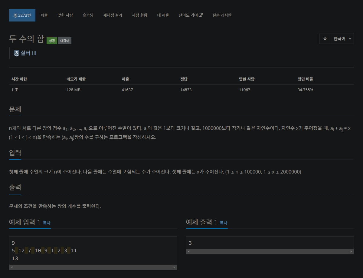 https://www.acmicpc.net/problem/3273