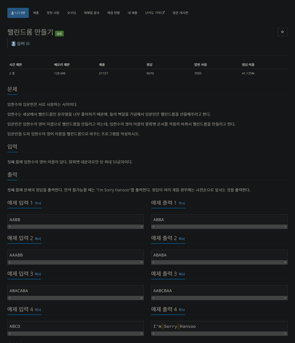 주어진 이름에서 각 알파벳의 등장 횟수를 세고, 팰린드롬을 구성하는 절반을 만든 후에 이를 조합하여 전체 팰린드롬을 만든다. 만약 주어진 조건으로 팰린드롬을 만들 수 없다면 "I'm Sorry Hansoo"를 출력한다.
