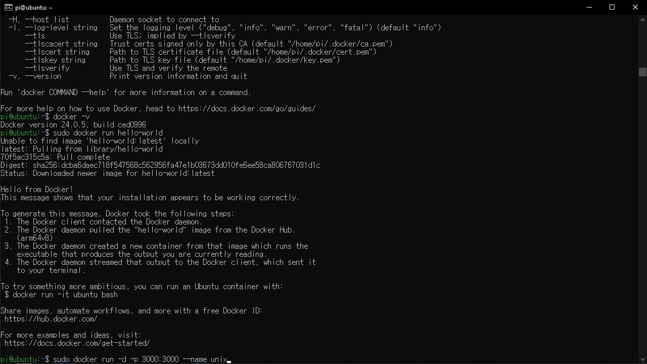정상적으로 Docker가 설치되어 version 확인과 hello-world 이미지를 실행해 본다.