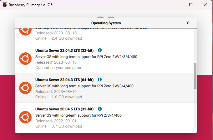 다양한 시스템에서 우분투 버전을 다르게 사용하기 위해 라즈베리 파이는 Ubuntu 20.04 32bit으로 결정하고 시도하였으나 Imager에서 지정한 32bit, 64bit 모두 실패하였다.