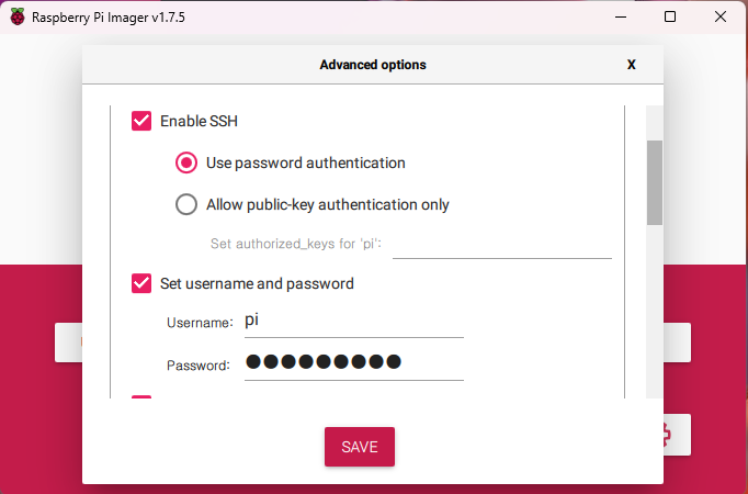 SSH를 체크하고 username과 password를 설정한다. 그 아래 WIFI를 지정하고 비밀번호까지 입력한다.