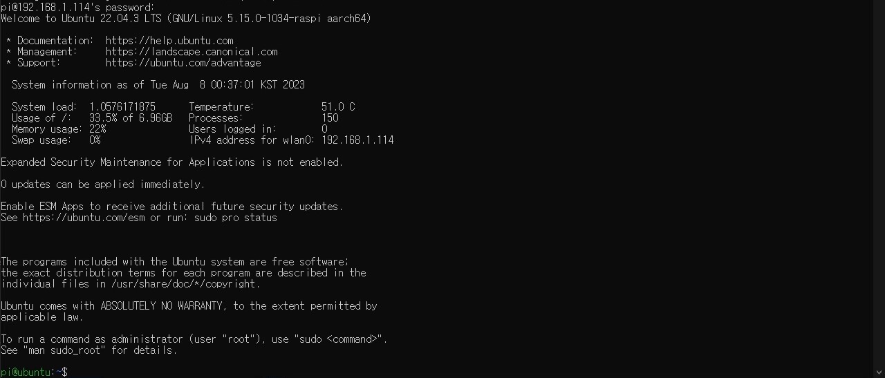 일단 micro SD에 Ubuntu가 정상 복사 되었으면, Raspberry Pi에 SD card를 넣고 5핀 전원만 넣어주면 물리적 설정은 끝난다. 화면이 없어 확인할 수는 없지만 부팅이 진행되고 지정해 두었던 wifi로 접속이 되고 있을 것이다. 몇 분 후 ssh를 이용하여 접속을 시도하면 Raspberry Pi에서 정상적인 응답이 온다.