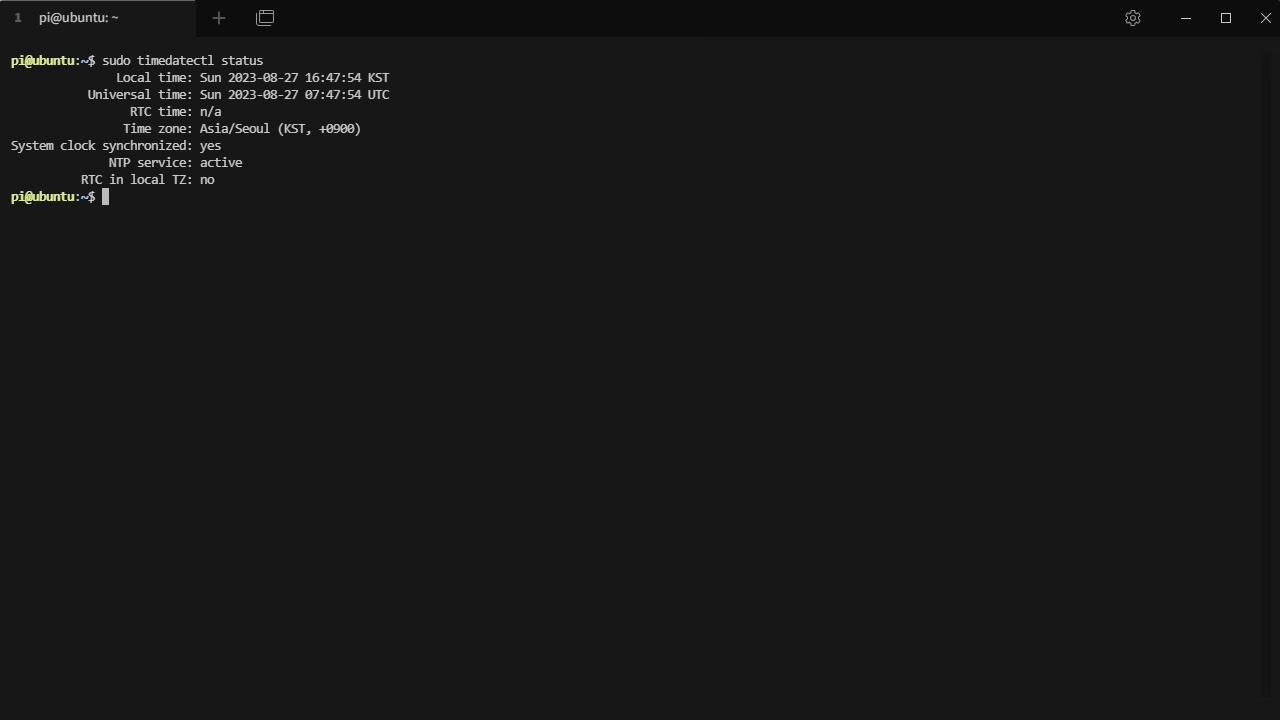 Raspberry Pi에 Ubuntu를 설치하고 수동으로 기입한 시간이 2분 가량 틀어져 있었는데, 이제 NTP 서버의 시각과 완전히 일치됨을 확인하였다.